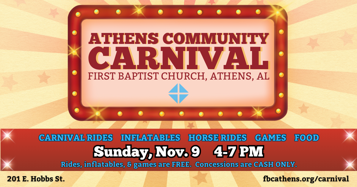 Grab your family and friends and join us at First Baptist Church, Athens, Alabama on Sunday, Nov. 9 from 4-7 PM!